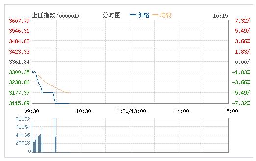 【香港商报网讯】沪深300指数盘中大跌逾7%,再次触及熔断阈值,A股今年来开市4天2天提前收盘。截至发稿,沪指跌7.24%报3124点;深成指跌8.35%报10745点。