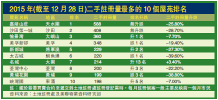 美聯物業資料研究部綜合土地註冊處資料指出,2015年(截至12月28日)註冊量最多的嘉湖山莊,錄588宗,較去年全年792宗大跌約25.8%,而第二位的沙田第一城更跌約29%至只有408宗。
