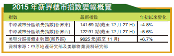 至於樓價方面,據最新的中原城市領先指數顯示,中原城市分區領先指數(新界東)報141.69點,全年(截至12月27日)升4.8%,中原城市分區領先指數(新界西)報122.91點,升5.6%。美聯分區樓價走勢圖則顯示,截至11月,新界區二手成交實用尺價平均為9825元,升6.7%,意味着雖然近月樓價呈現跌勢,但新界樓價2015年全年仍錄半成升幅。