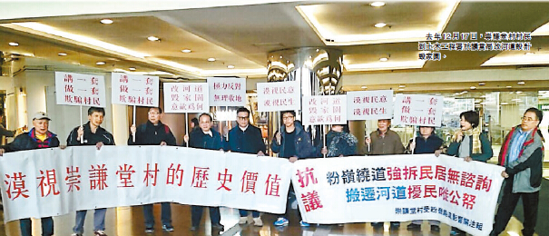 【香港商報網訊】記者周駿報道:伴隨粉嶺崇謙堂村人生活歷程的麻笏河,因政府在粉嶺繞道工程的設計中,擬改河道穿村而過,該村村民認為當局無諮詢,是漠視民意。12月17日,該村部分村民於政府土木工程拓展署示威,抗議當局欺騙村民,改河道是家園的設計,村民要求其在設計淺隧道地面部分延伸500米,沿麻笏河外圍工業區通過,避免改河道擾民。村民聲稱,若未能如願,不排除申司法覆核。署方與村民會面時表示,答允再檢視設計方案。