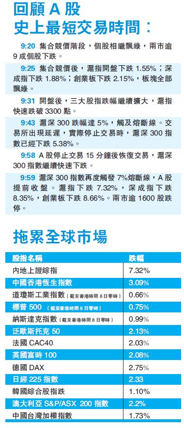 昨日A股因开盘不久就触及熔断阀值,在上午10时前便早早收市,创下史上最快收盘纪录。受恐慌情绪带动下,港股昨天再成环球「提款机」。港股昨日以过千亿成交暴挫647点,收报20333点,创下两年半低位。