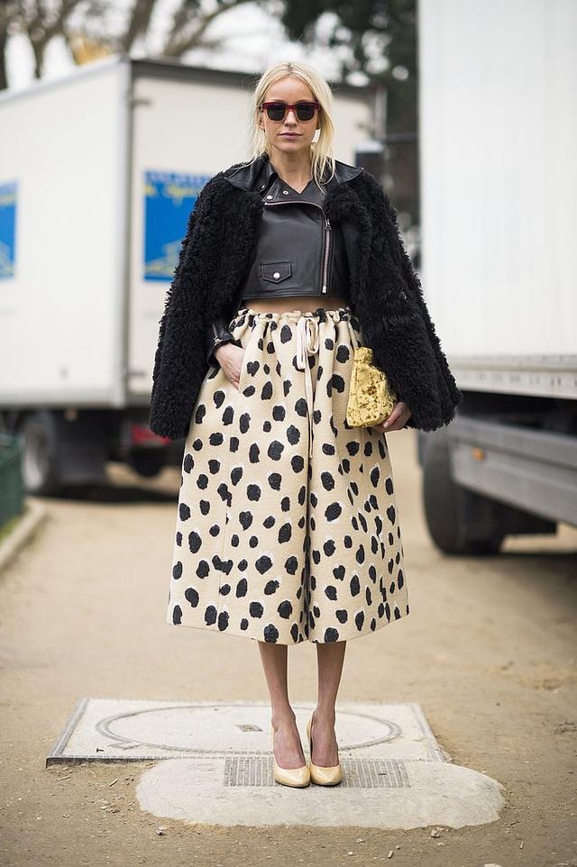 伞裙营造出一种下身宽松的感觉,上身可以选择短款皮夹克,适合梨型身材的女孩穿着。