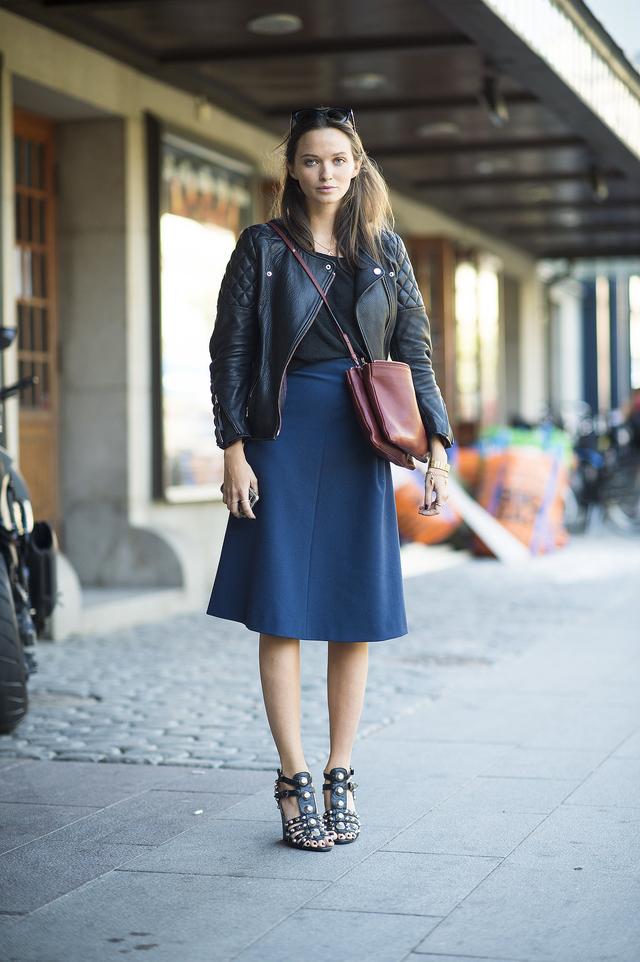 A字裙最具有淑女风了,好像和酷酷的皮夹克格格不入,但是两件单品的碰撞,效果还是不错的。