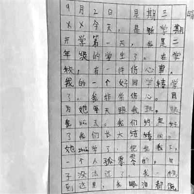 “今天,是新学期的第一天,我是二年级的学生了,在学校,有一件伤心事。我的一个好同学转学了,我非常伤心,因为她每天跟我玩,跟我聊天,我们约定好长大结婚的。她转学了,把我丢下,一个人孤零零的,日子没法过了。我一想到这里,我眼泪都流下来了。我和爸爸妈妈还有姐姐聊这事,妈妈说:‘你可以再去找别的女人啊’。我说:‘她是世界上最美的女人。’听我这么一说,爸爸、妈妈还有姐姐都无语了。我很想去上海看你,可是我没钱,我只好在路桥等你。”