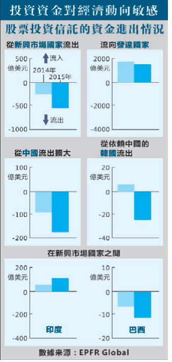2015年8月底發生的源自中國的全球股市聯袂下跌顯示出,世界第二大經濟體遭遇挫折之際沖擊巨大。以中國屬於最大貿易夥伴的韓國的股票投信為例,此前流入的資金在2015年已開始流出。