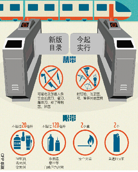 今日起,全国铁路将实行新的列车运行图。按照新图,广铁管内共加开旅客列车74.5对,其中动车组64.5对。同时,新的铁路“禁带目录”也于今日起实行,菜刀、餐刀、射钉枪等禁止带上车,火柴、打火机甚至指甲油携带数量都有了严格限制。