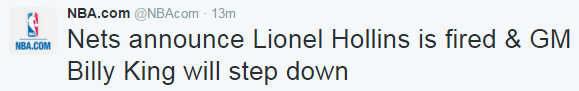 1月11日讯 据名记肯-贝格在自己的推特中爆料,篮网已经对管理层进行重大改组。总经理比利-金与主帅霍林斯双双下课,随后篮网官方对这条消息进行了证实。