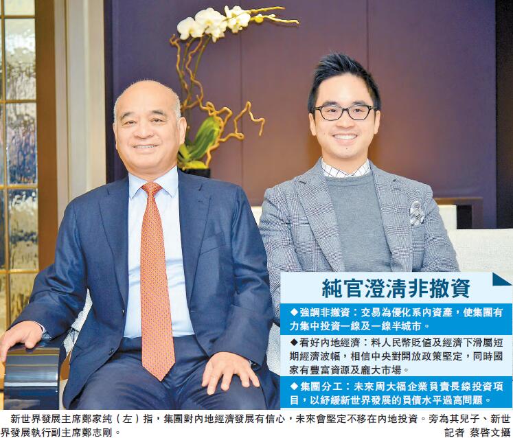 【香港商報網訊】記者鄭達偉報道:面對環球經濟氣候持續低迷,不少上市公司開始調整投資策略,以便在經濟寒冬中安然度過,如本地地產巨頭新世界系,早前便陸續轉讓內地資產,惟做法同時惹來撤資疑雲。該集團主席鄭家純(又稱「純官」)昨日現身說法,強調集團無意撤資之餘,亦力挺內地經濟發展前景。
