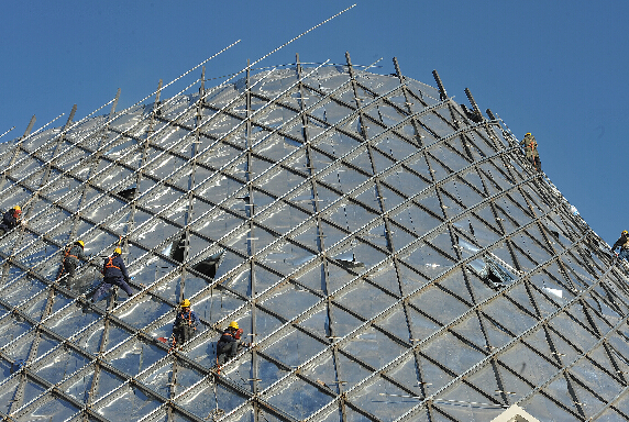 在2016唐山世園會項目工程之一的南湖國際會展中心,施工人員在安裝玻璃幕墻。