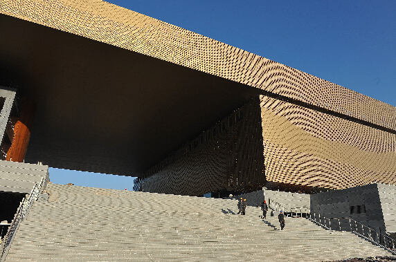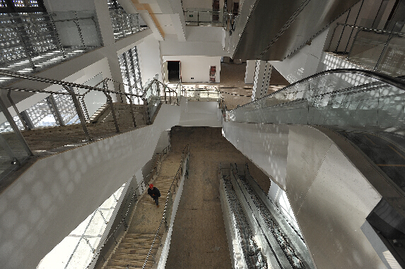 一名建設者在2016唐山世園會一處在建場館內行走。