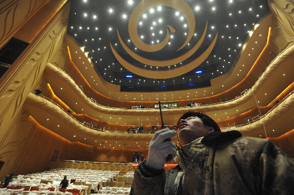 施工人員在2016唐山世園會項目工程之一的唐山大劇院內安裝座椅。