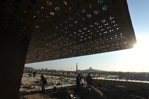 1月11日,幾名建設者從2016唐山世園會項目工程之一的唐山大劇院門前走過。