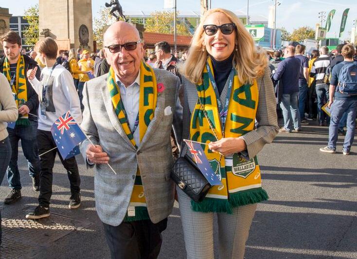 资料图:当地时间2015年10月31日,英国伦敦,传媒大亨鲁珀特·默多克和霍尔一起观看橄榄球世界杯决赛。