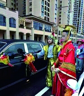 昨日,记者在被刷爆的微信朋友圈上看到,新郎不仅是一身“皇帝”装扮,接亲的兄弟伴郎团也都是以“将军”和“士兵”服饰出现,一行接亲队伍气势非凡。和其他土豪婚礼一样,“皇帝”穿越的婚礼自然也少不了大量的现金和首饰。还有消息称,新郎接亲时奉上的礼金就高达数百万元。另外,现场照片显示,娇美的新娘脖子上挂着近百个金镯子,头上硕大的金色“凤冠”头饰即使从后面看也令人目眩。