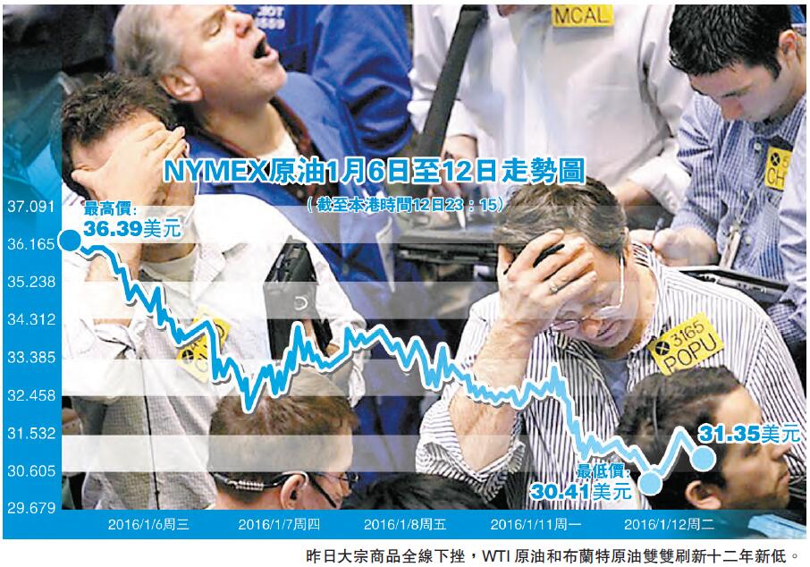 【香港商报网综合报道】大宗商品「惨不忍睹」的走势并未因中国股市企稳而改变。昨日大宗商品再度全线下挫,除了WTI原油和布兰特原油双双刷新12年新低外,镍价亦创2003年以来最低水平,钯金则重挫跌4.7%,刷新2010年7月来最低水平。伊朗即将解除制裁意味着供应过剩会继续恶化,交易商纷纷下调油价预期。