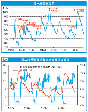 當然,圖二亦見到,失業率與筆者的計算結果不算是同步,例如首次出現25個州份的失業率高於全美失業率是1986年1月,但失業率真正見底是在1989年3月,滯后三年多。不過,其后1998年則稍縮短至兩年,而2006年則同步在當年的10月見頂及見底。雖然單以圖二亦難預計現時失業率是否已經見底,但把二圖一并來看,能得出一個結論:失業率見底之時不遠矣。