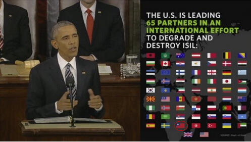 美国总统奥巴马今天的国情咨文演说,白宫照例透过官网直播,并自制图表,在奥巴马介绍美国领导65个伙伴国家(及地区)对抗“伊斯兰国”时,白宫的图卡上竟然秀出“中华民国国旗”。