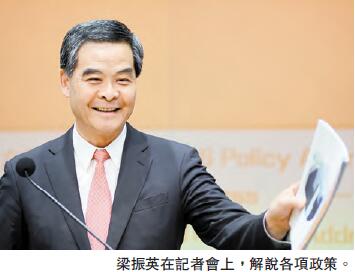 梁振英續稱,《施政報告》都提出各方面民生措施,包括扶貧、安老、助弱等,是繼承過去3年這幾方面的工作,當局繼續做下去,政府不僅投放大量精力,投入財政亦增加相當多;他亦稱,房屋問題仍困擾港人,當局不能半途而廢;不過,政府沒有將樓價降到某個水平的目標,惟有建屋的目標。