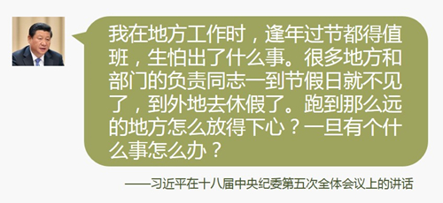 當領導干部就要有強烈的責任感,節假日尤其要自覺堅守崗位。沒有說不讓休息,但關鍵是如何休息、在哪兒休息,有沒有考慮到自己肩負的職責。大部分領導干部在這個問題上做得是好的,節假日都能自覺堅守崗位。這不也是一種規矩嗎?