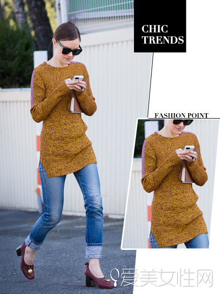 橙色的长款毛衣赚足了眼球,搭配破洞卷脚牛仔裤,潮流个性,白球鞋演绎街头风。