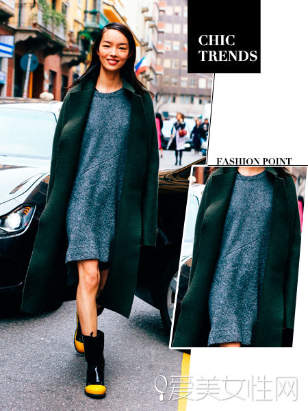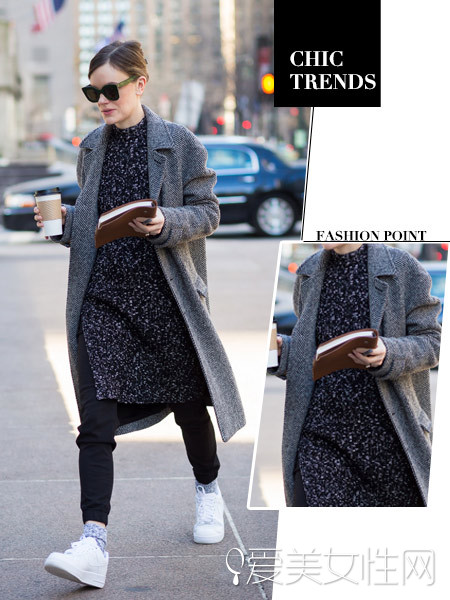 黑色长款毛衣侧面开衩的设计能够打破冗长的造型,还增加了特色,外搭灰色的大衣形成一体,白色球鞋让装束立马清爽起来!