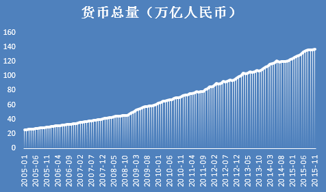 這一惡化可要緊了,中國政府為了維持住原有的泡沫不破裂,被迫投放了天量貨幣(圖四)維持局面,通過讓貸款展期等方式,讓負債累累的鋼鐵廠、造紙廠和地方政府等得以不至于破產。如今人民幣總量已經接近140萬億!而為了降低企業和政府的還債壓力,周小川主導的央行又在2014年底啟動了降息降準周期。而美國那邊,在經歷了漫長的零利率時代之后,美聯儲也終于在2015年底進入了升息周期。