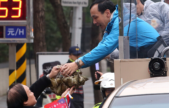 朱立伦(右)15日偕妻高婉倩台北扫街,有民众送上粽子祝他包中。中央社