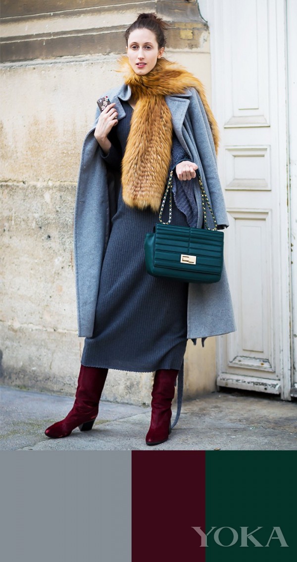 相对于主打轻柔明快色彩的春夏,秋冬自然要走一些深沉内敛的色调。虽然都说红配绿一台戏,但是像这样偏深的褐红色和深绿色组合到一起却并不会产生太夸张的视觉效果,比如像这组搭配示范就是将红绿运用在配饰上,在以灰色为主调子的搭配中调和得恰到好处!