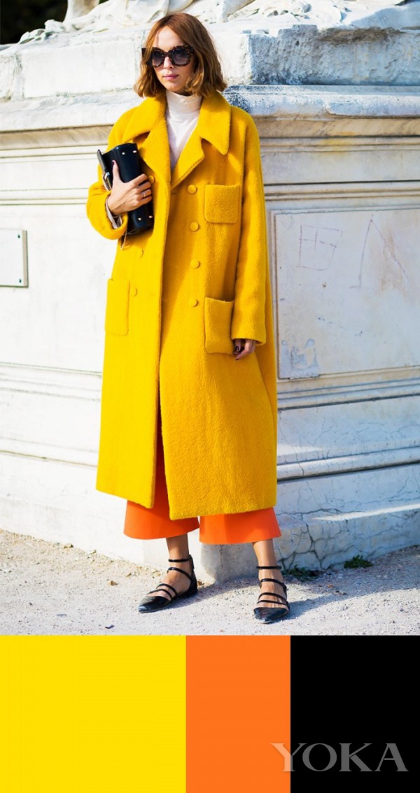 暖色调其实特别适合冬天穿,尤其是亮眼的柠檬黄和橙色,就像雪后的一抹阳光,在寒冷的冬日带来无限活力与温暖的感觉!然而对于这种饱和度高的色彩,如果和其他同样高饱和度相撞会过于夸张,所以需要黑色来压制一下。