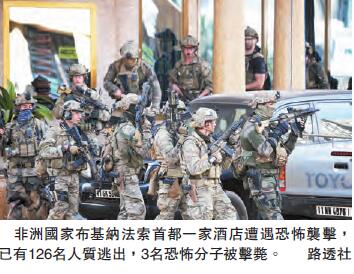 當地時間15日晚,非洲國家布基納法索首都瓦加杜古,數名持械的蒙面男子襲擊一間多為西方遊客及聯合國職員入住的酒店。據外媒昨日報道,布基納法索內政部長稱,目前已經有126名人質從遭恐怖分子襲擊的首都酒店中逃出,3名恐怖分子被擊斃。