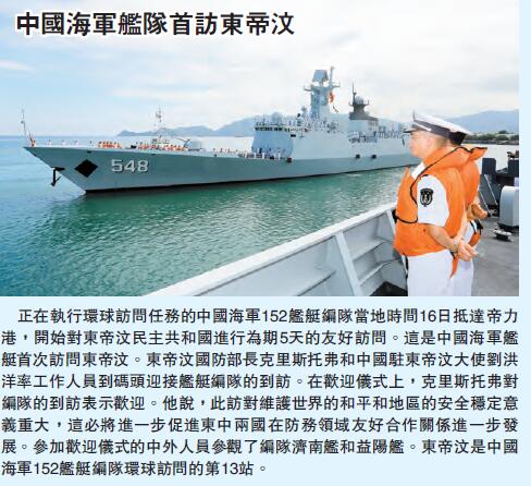 正在執行環球訪問任務的中國海軍152艦艇編隊當地時間16日抵達帝力港,開始對東帝汶民主共和國進行為期5天的友好訪問。這是中國海軍艦艇首次訪問東帝汶。東帝汶國防部長克里斯托弗和中國駐東帝汶大使劉洪洋率工作人員到碼頭迎接艦艇編隊的到訪。在歡迎儀式上,克里斯托弗對編隊的到訪表示歡迎。他說,此訪對維護世界的和平和地區的安全穩定意義重大,這必將進一步促進東中兩國在防務領域友好合作關係進一步發展。隨後,參加歡迎儀式的中外人員參觀了編隊濟南艦和益陽艦。東帝汶是中國海軍152艦艇編隊環球訪問的第13站。