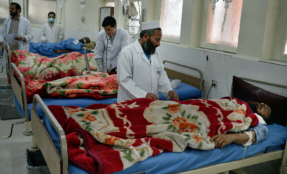 上图为在阿富汗东部楠格哈尔省首府贾拉拉巴德市,医生在治疗炸弹袭击的受伤者。