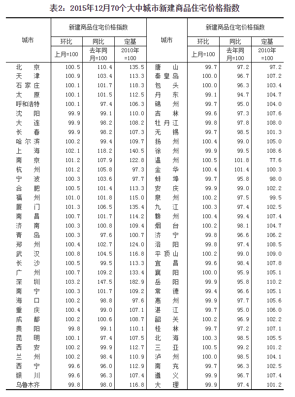 新華網消息 國家統計局1月18日公布的數據顯示,2015年12月份,全國70個大中城市新建商品住宅和二手住宅價格延續上月走勢,環比繼續小幅上漲。