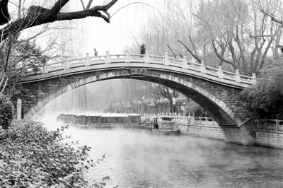 1月17日,行人从水汽蒸腾的济南环城河琵琶桥上走过。当日,山东济南出现大幅降温天气。济南各大泉池喷涌而出的泉水遇冷凝结成水汽,仿佛云雾一般漂浮在水面上,形成“云雾润蒸”景观,让人流连忘返。