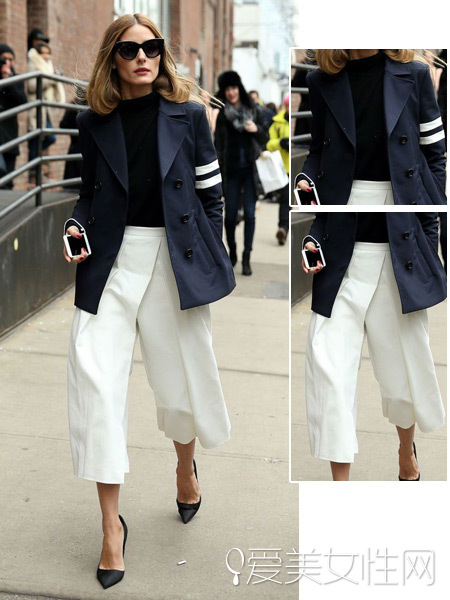 【搭配示范】:深蓝色外套+黑色打底衫+白色七分阔腿裤+黑色尖头鞋