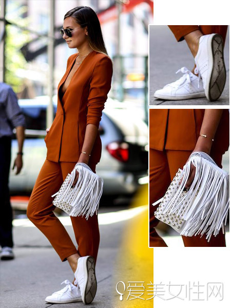 【搭配示范】:西装套装+白色运动鞋+白色流苏手拿包。