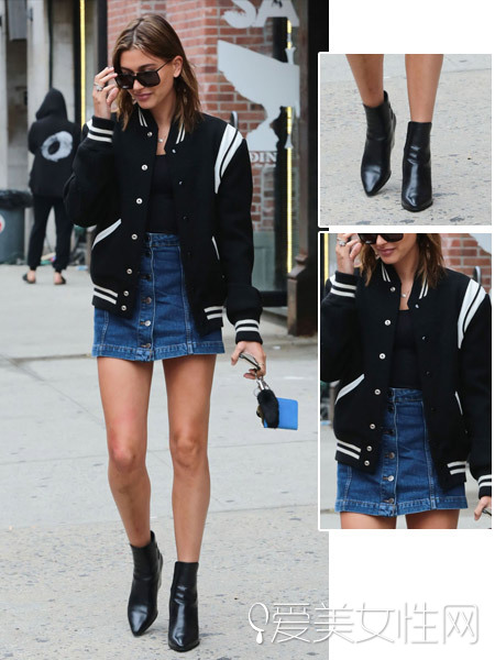 【搭配示范】:黑色棒球衫+牛仔短裙+黑色短靴。