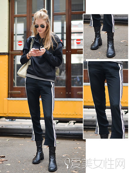 【搭配示范】:黑色卫衣+黑色运动裤+黑色短靴。