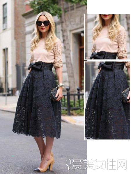 【搭配示范】:裸色蕾丝上衣+黑色蕾丝裙+尖头高跟鞋。