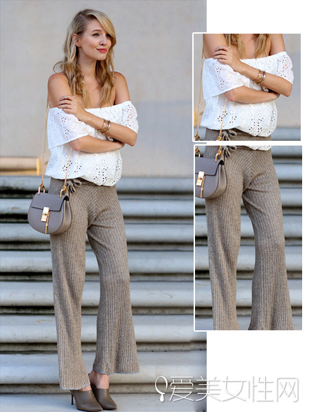 【搭配示范】:白色一字肩蕾丝上衣+长裤+短靴。
