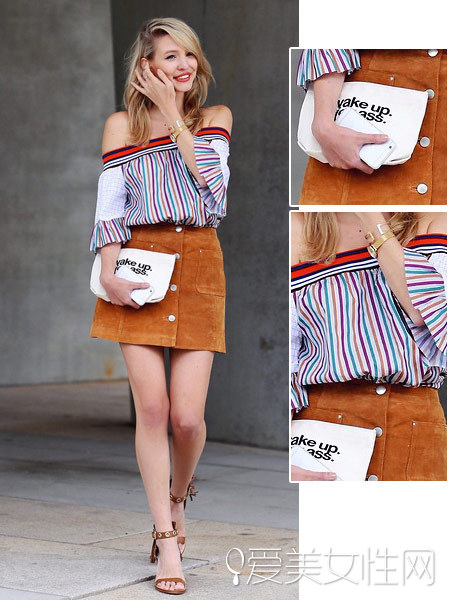 【搭配示范】:一字肩上衣+深棕色包臀裙+凉鞋。