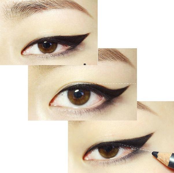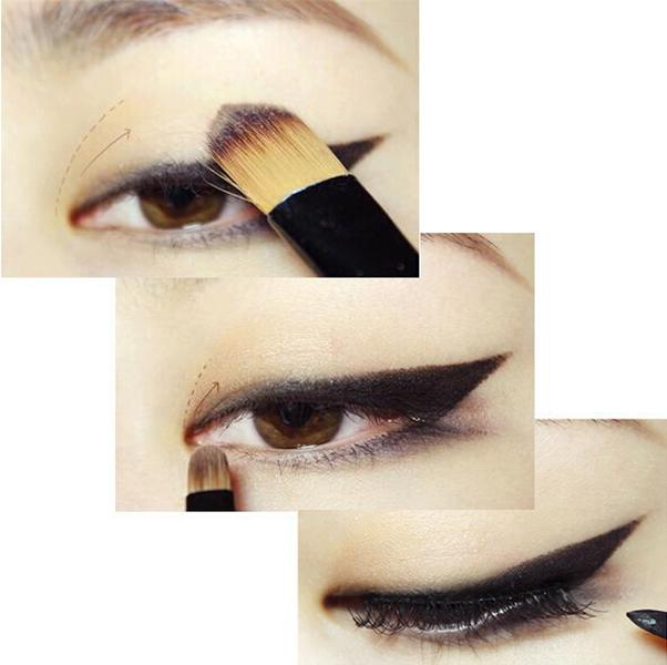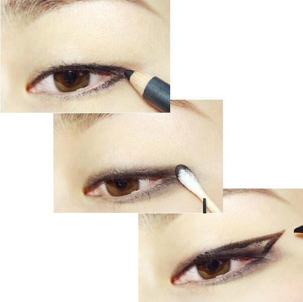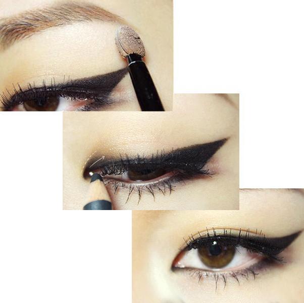 化妆步骤: 1、和平常一样,先打好底妆。 2、用眉刷蘸取接近发色的眉粉,顺着眉毛生长的方向给眉毛填充颜色。 3、用眉笔描绘眉毛的轮廓,让眉毛的形状和轮廓更突出。 4、用眼线笔沿着睫毛根部,描绘上眼线和后二分之一的下眼线。然后用化妆棉或者手指,将上眼睑微微抬起,然后用眼线笔填充内眼线。 5、用棉签将黑色眼线晕染开,让颜色更自然。 6、用眼线笔描绘出如图中所示的“猫眼”轮廓。 7、用眼线笔描绘出“猫眼”的轮廓后,用眼线笔或者眼线膏、眼线液来做填充即可。眼线笔和眼线膏涂抹出的颜色会更自然,眼线液涂抹的更有戏剧效果,而且不容易晕妆。具体看大家自己的喜好。 需要注意的是,“猫眼”的眼尾最好和上眼睑的中间位置在同一个水平线上。而下眼影和上眼睑的中间位置需要呈现一条斜直线。 8、用眼影刷蘸取大地色眼影,从眼头位置开始向眼尾方向进行涂抹,让眼睛看起来更立体 9、用小号眼影刷蘸取深棕色眼影,涂抹在眼头的位置,让眼睛更加深邃。 10、佩戴自然的假睫毛,然后用睫毛夹将自己的睫毛和假睫毛一起夹卷翘,再涂抹两层睫毛膏即可。 11、用眼影刷的海绵头蘸取白色眼影,涂抹在眉毛下方、眉骨的位置。给眉骨提亮,可以视觉上拉开眼睛和眉毛的距离,让眼睛更大很有神采。 眼妆的部位就完成啦!接下来是唇部~ 12、先轻抹一层润唇膏滋润唇部肌肤,然后用纸巾将润唇膏轻轻擦掉。在用粉饼或者蜜粉轻压,遮盖唇线与嘴角。 13、上唇由唇峰开始化向唇角,而下唇则应该从嘴角化至中央。涂抹唇膏后双唇轻轻含住纸巾,印掉一层唇膏。然后再重新涂抹一次,让妆效更持久。 14、用化妆刷蘸取唇膏,涂抹在颜色不足的位置,让双唇轮廓更饱满有型。 这款妆容的步骤并不多,最重要的是“猫眼”的轮廓和一支饱和度高、颜色正的唇膏。如果平时习惯了淡淡的伪素颜妆,或者干脆没化过妆都可以尝试一下哦~