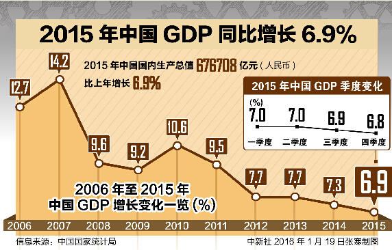 國家統計局數據顯示,初步核算2015年中國GDP為676708億元,按可比價格計算,較上年增長6.9%,是1990年以來全年GDP增速首次跌破7%。