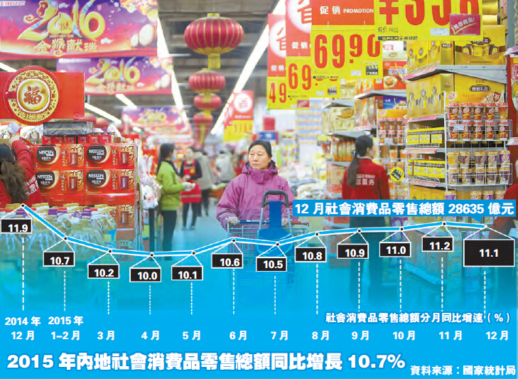 在外貿遇冷、投資增速回落的情況下,消費成為中國經濟的「頂梁柱」。國家統計局局長王保安昨日表示,2015年,最終消費支出對國內生產總值(GDP)的貢獻率為66.4%,比上年提高15.4個百分點。2015年,兩位數增長的消費數據在內地經濟的成績單中格外醒目。