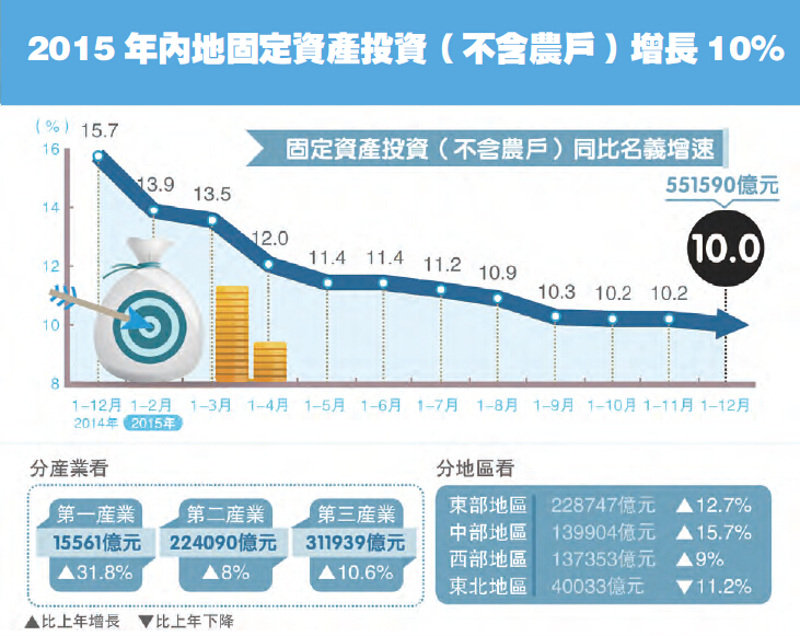此外,2015年,規模以上工業增加值比上年增長6.1%,創金融危機以來最低增速;固定資產投資同比增10%,亦創15年來新低。