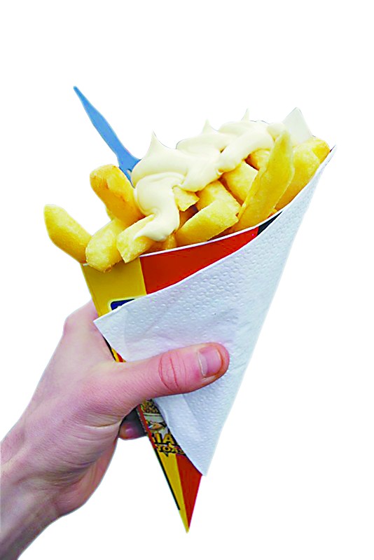 展厅内还专门设计了一个“油炸小屋”,通过工作人员现场操作,展示比利时薯条的特别之处——首先必须要选用新鲜的土豆作为优质原料,然后切成手指粗细的柱状体配以精制牛油。值得一提的是,比利时的薯条不同于美式细薯条,一定要足够粗才被认为足够正宗、香甜。炸制过程则要重复两遍:先以低温过油,10分钟后升至高温炸脆。《环球时报》记者观察到,工作人员在薯条炸好后马上提起锅一边摇晃一边撒盐,他告诉记者,还可以撒一些糖粒,再配以番茄、芥末、辣椒、蜂蜜、蛋黄等各种各样可供选择的调味酱。做好的薯条外焦里嫩让人垂涎欲滴(如图)。