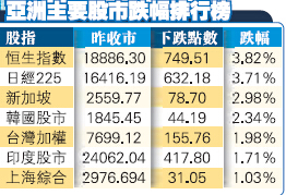 相比較而言,港股表現最差。恒指昨低開約300點後持續向下,低見18833點;全日收跌749點或3.82%,報18886點;國指報8015點,跌362點或4.33%。主板成交放大,至922億元。今年以來,恒指已下跌10%。