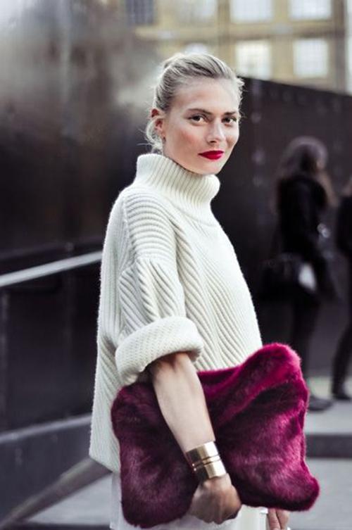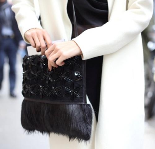 为什么街拍达人喜欢毛毛包?因为冬天冷啊,什么?包包也会冷?当然不是,很多街拍达人喜欢毛毛的手包,是因为在冬日毛毛包摸起来感觉的确是比皮包暖和多了,抱在怀里像暖宝宝,还能顺便买个萌,何乐不为。