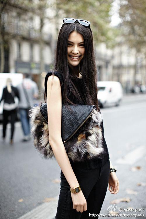 真心的,毛毛包和衣服的搭配,黑白配帅气的不要不要的,如果你是不穿黑白会死星人,不妨试试毛毛包。