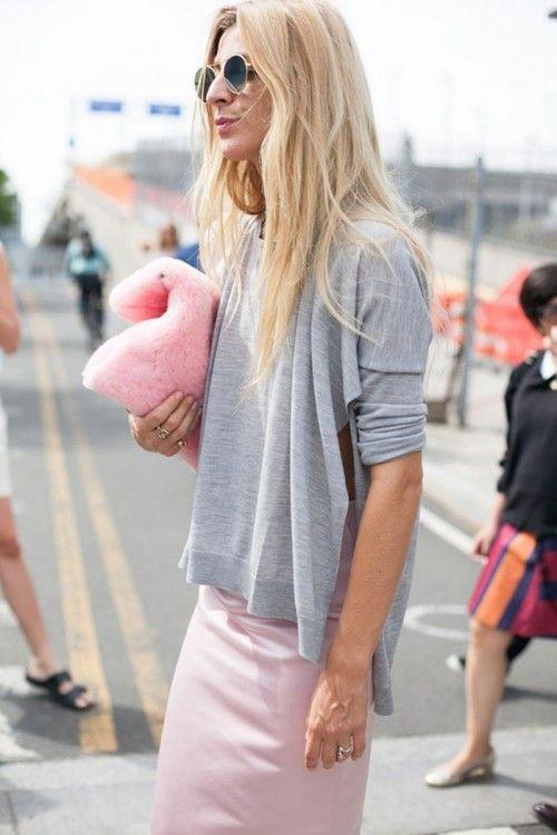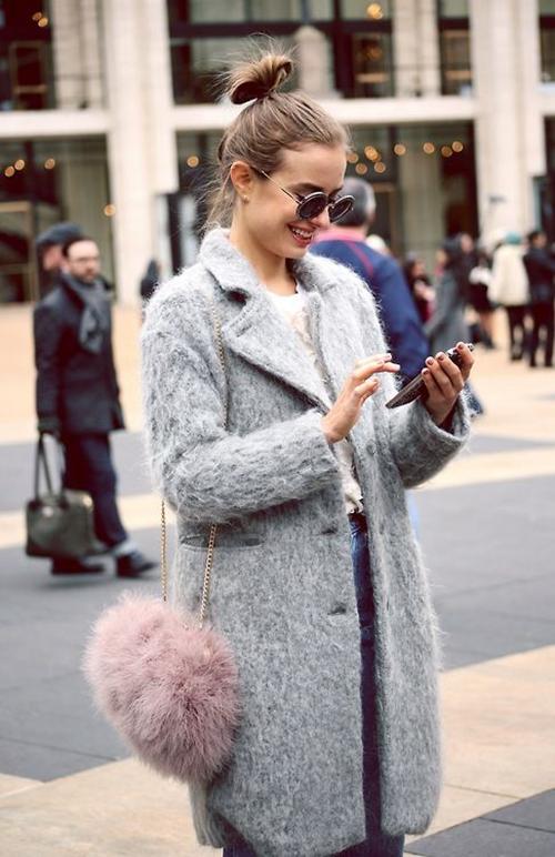 最可爱的就要属圆圆一小坨的毛毛包啦,这样的包包适合手拿也适合肩背,像这种低饱和度的粉色,配灰色的衣服再合适不过了。